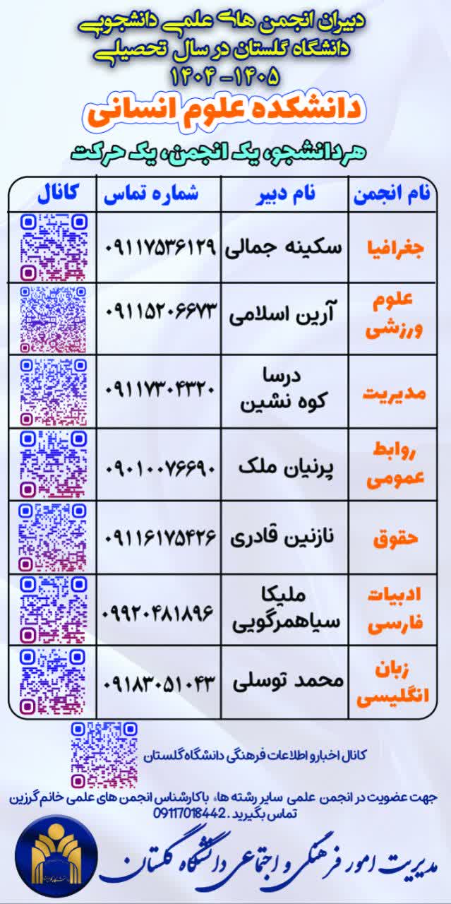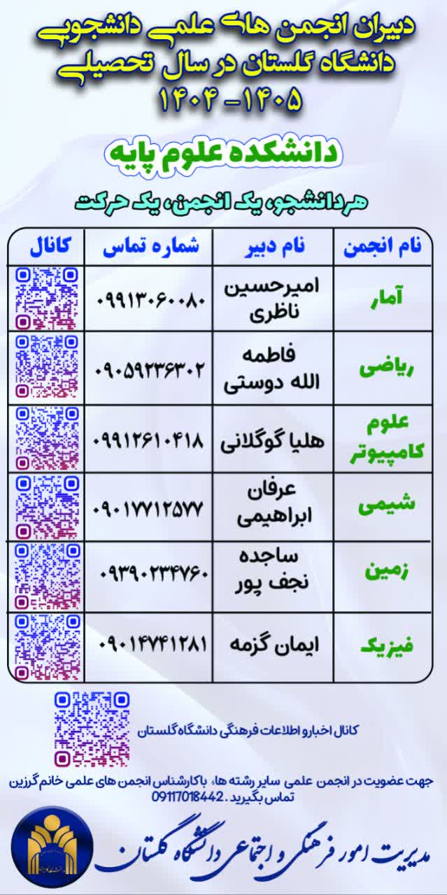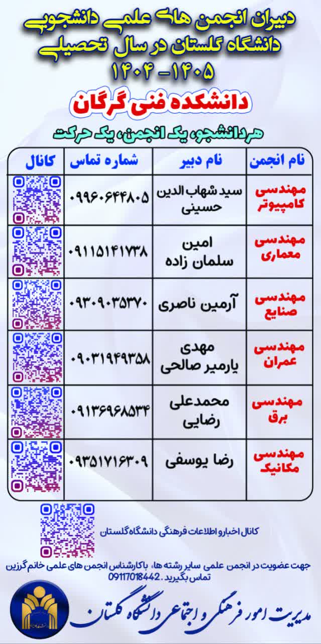 دنبال فرصتهایی برای رشد، تجربه، مهارتآموزی و شبکهسازی هستی؟ عاشق علم، نوآوری، رویدادهای هیجانانگیز و کار تیمیای؟ وقتشه که از فضای کلاس و جزوه فراتر بری و عضوی از انجمن های علمی دانشکده خودت بشی! ما در دانشگاه گلستان، با راهاندازی پویش "هر دانشجو، یک انجمن، یک حرکت" از تمام دانشجویان علاقهمند و باانگیزه دعوت میکنیم که با عضویت در انجمنهای علمی، مسیر رشد علمی و عملی خودشون رو شروع کنن ایدههاشون رو تبدیل به پروژه و رویداد کنن در کنار دانشجوهای فعال، یاد بگیرن، تجربه کنن و بدرخشن انجمنهای علمی، جایی برای ساختن آیندهات هستن! هر دانشکده، هر رشته، یک انجمن علمی مخصوص خودش داره! با یک کلیک، یک پیام یا یک تماس، به جمع ما بپیوند! اطلاعات تماس دبیران انجمنها، کانالهای ارتباطی و راههای عضویت رو در پوستر همین اطلاعیه ببین و اولین قدم رو بردار... تو حرکت رو بساز! انجمن از تو شروع میشه!